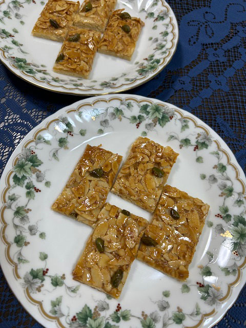 サクサククッキー生地に、アーモンド、ピスタッチオ、ハチミツ、バターの入ったキャラメル生地を流し込んで焼き上げた贅沢なクッキーです。